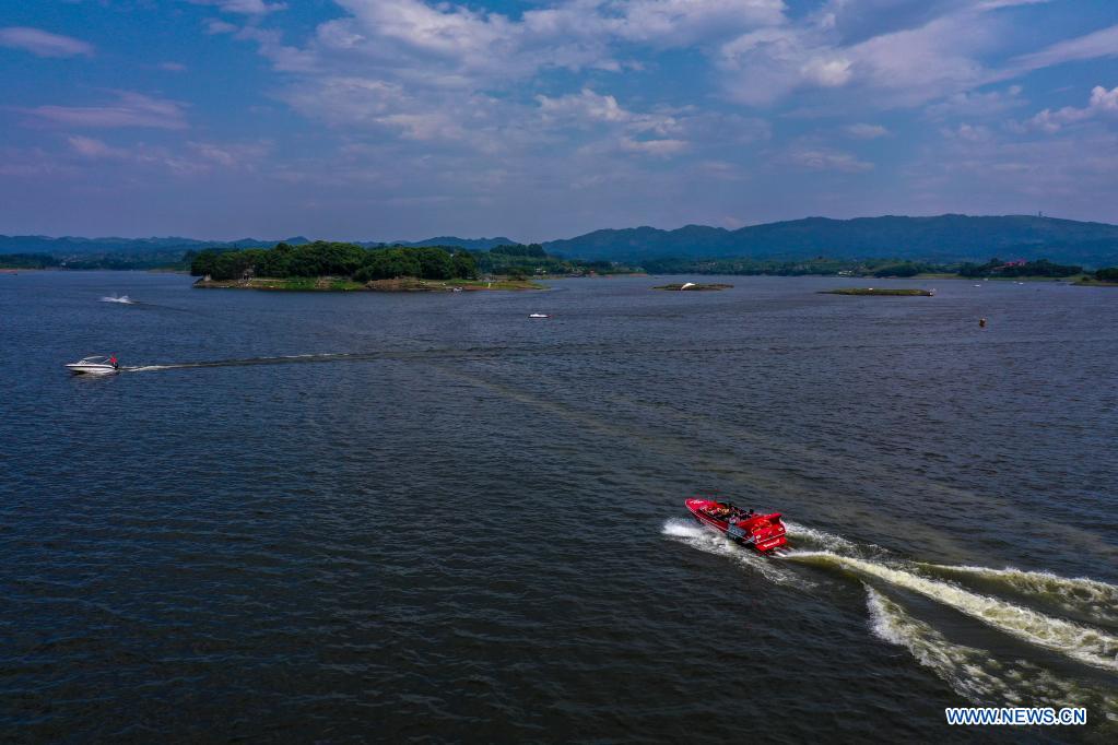 2日、重慶市の長寿湖景勝地で、観光客を乗せて進むモーターボート。(小型無人機から、重慶=新華社記者/劉潺)