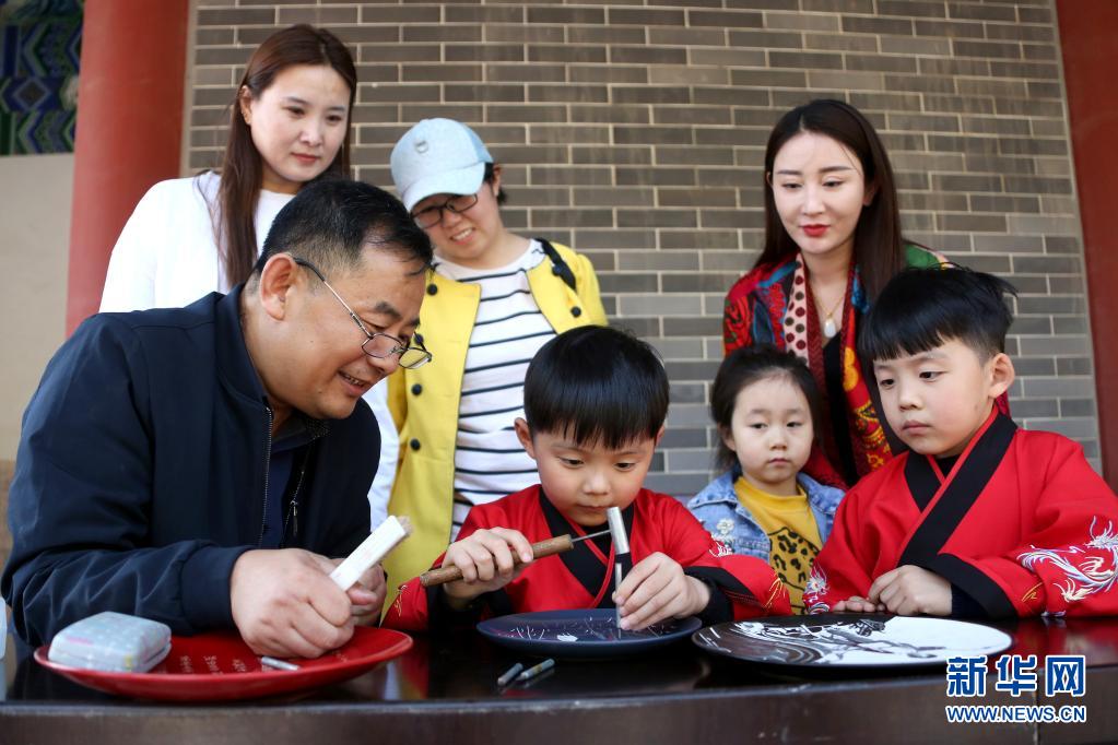 1日、山東省棗庄市孟庄鎮の亀山風景区で、無形文化遺産の磁器彫刻の技術を子どもたちに教える民間芸術家の胡安同(こ・あんどう)さん(前列左)。(棗庄=新華社配信/孫中喆)
