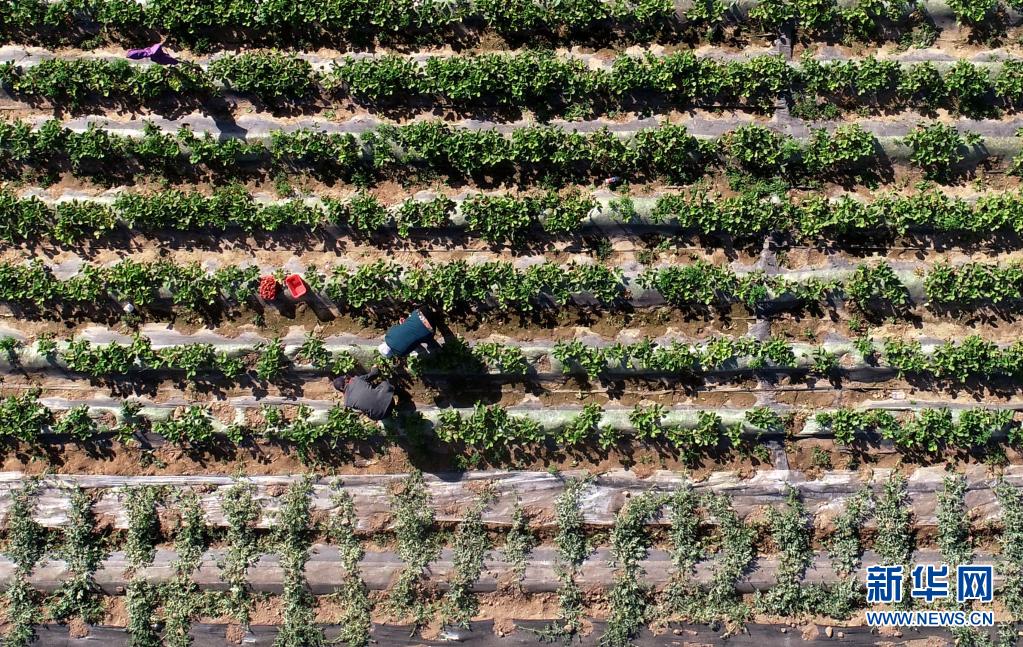 5日、河北省石家荘市新華区杜北郷のイチゴ栽培基地で、収穫作業に励む農家の人たち。(小型無人機から、石家荘=新華社配信/梁子棟)