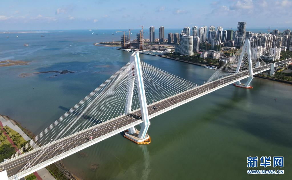 3日、海口市のランドマーク、世紀大橋。(小型無人機から、海口=新華社記者/楊冠宇)
