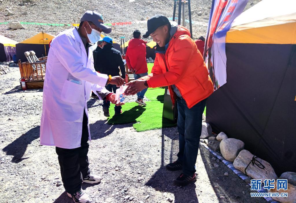 9日、ベースキャンプに入るチベット自治区登山協会職員の手を消毒する医師。(チョモランマベースキャンプ=新華社記者/王沁鷗)