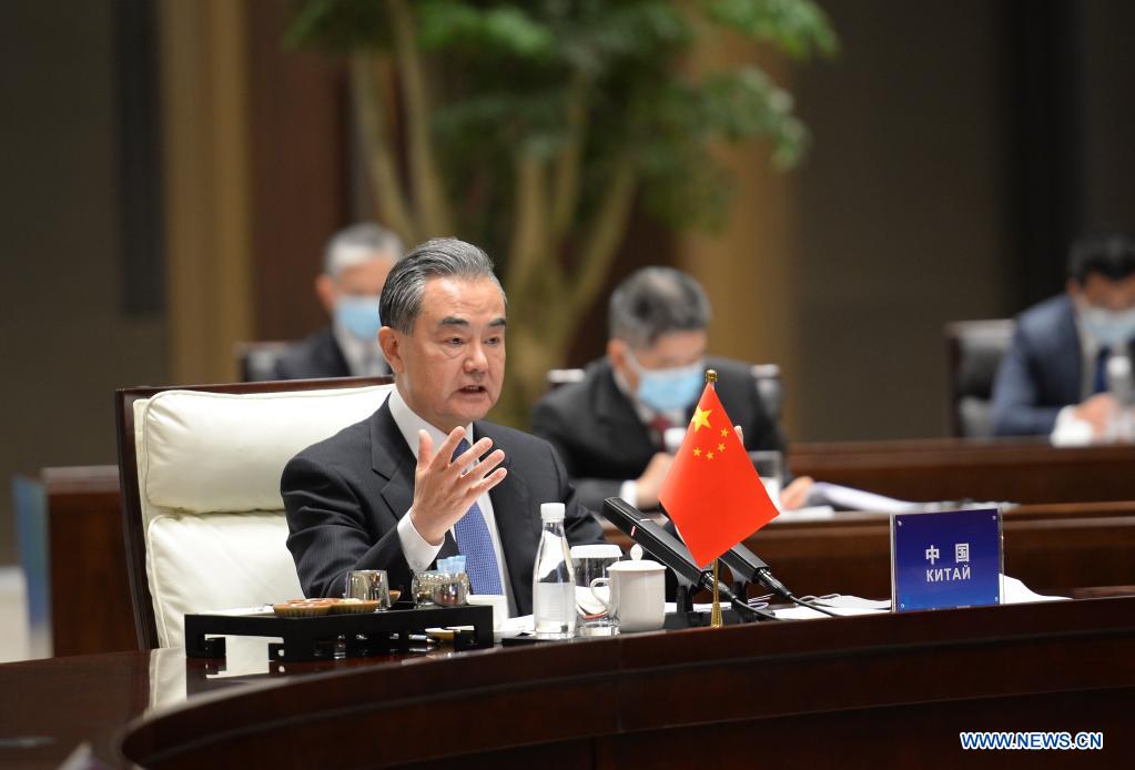 12日、陝西省西安市で開かれた「中国+中央アジア5カ国」外相第2回会合で発言する王毅氏。(西安=新華社記者/魏翔)