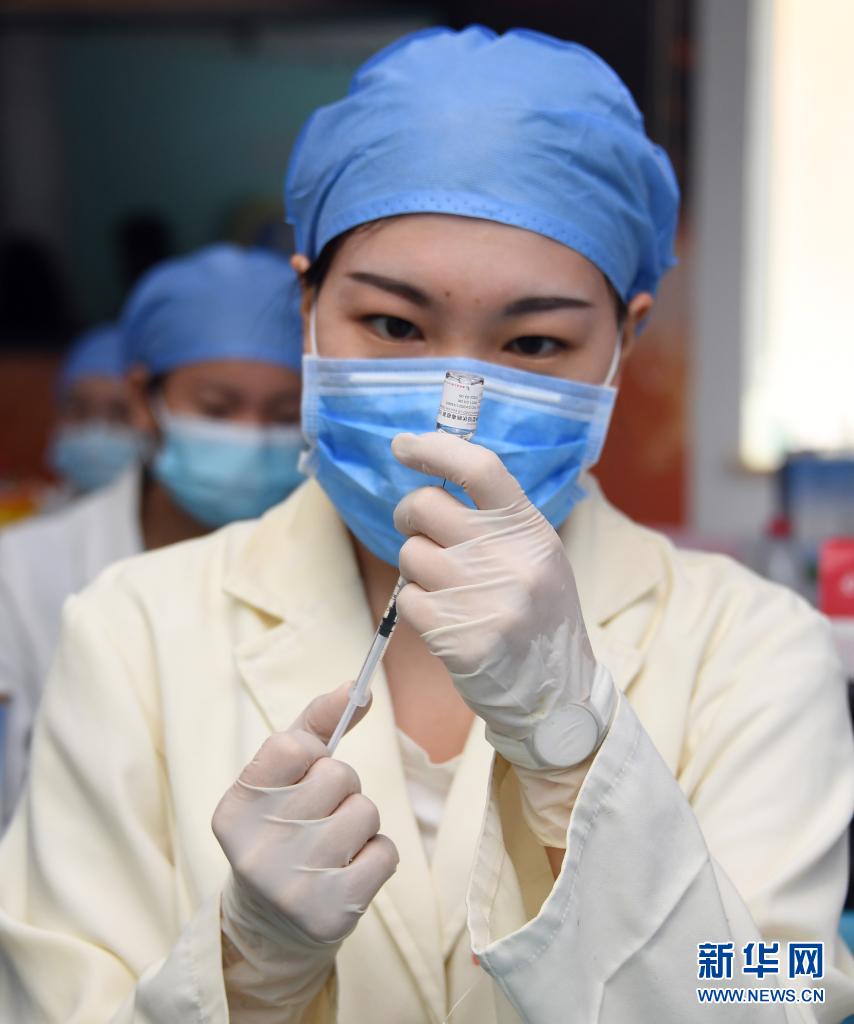 20日、北京市海淀区花園路街道の新型コロナワクチン臨時接種拠点で、1回接種型のワクチンを持つ医療スタッフ。(北京=新華社記者/任超)