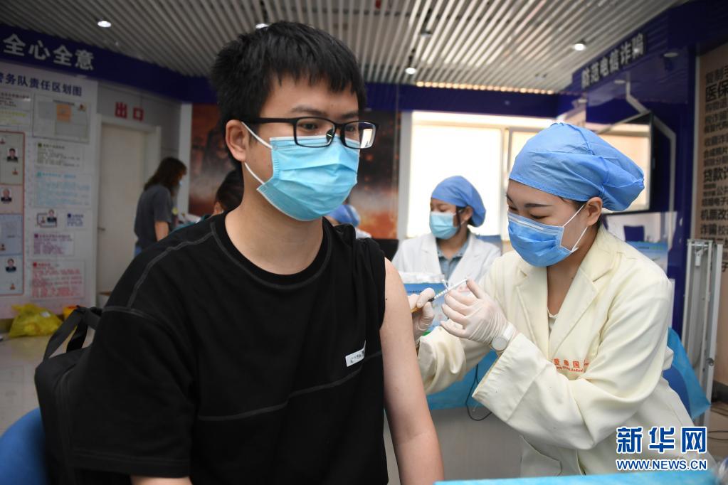20日、北京市海淀区花園路街道の新型コロナワクチン臨時接種拠点で、市民に1回接種型のワクチンを接種する医療スタッフ。(北京=新華社記者/任超)