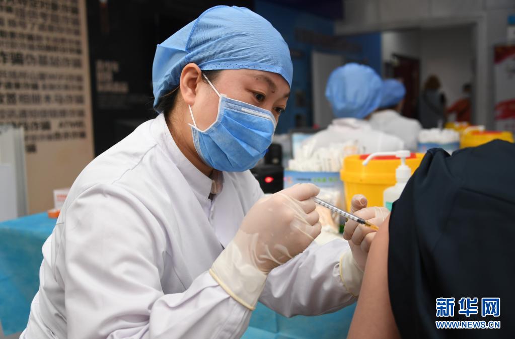 20日、北京市海淀区花園路街道の新型コロナワクチン臨時接種拠点で、市民に1回接種型のワクチンを接種する医療スタッフ。(北京=新華社記者/任超)