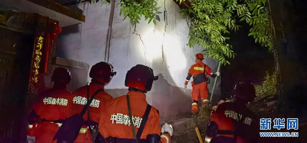 22日未明、雲南省大理ペー族自治州の被災地で、救援活動にあたる救助隊員。(漾濞=新華社配信)
