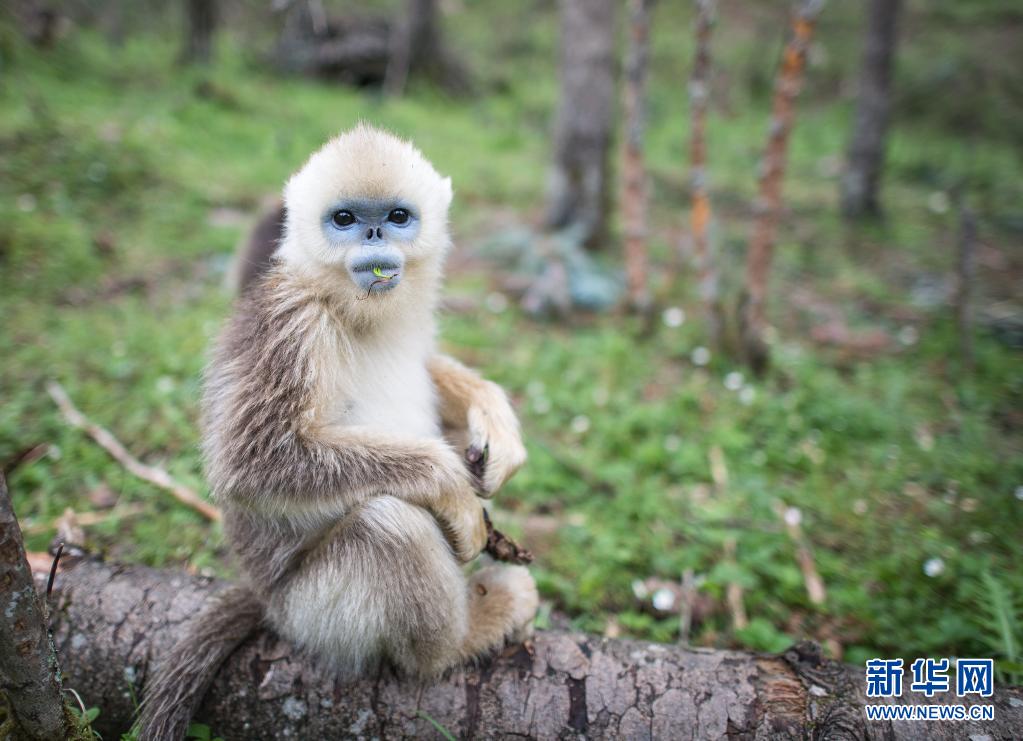 19日、神農架国家公園大竜潭キンシコウ野外研究基地内の山林に生息する子どものキンシコウ。(神農架=新華社記者/肖芸九)