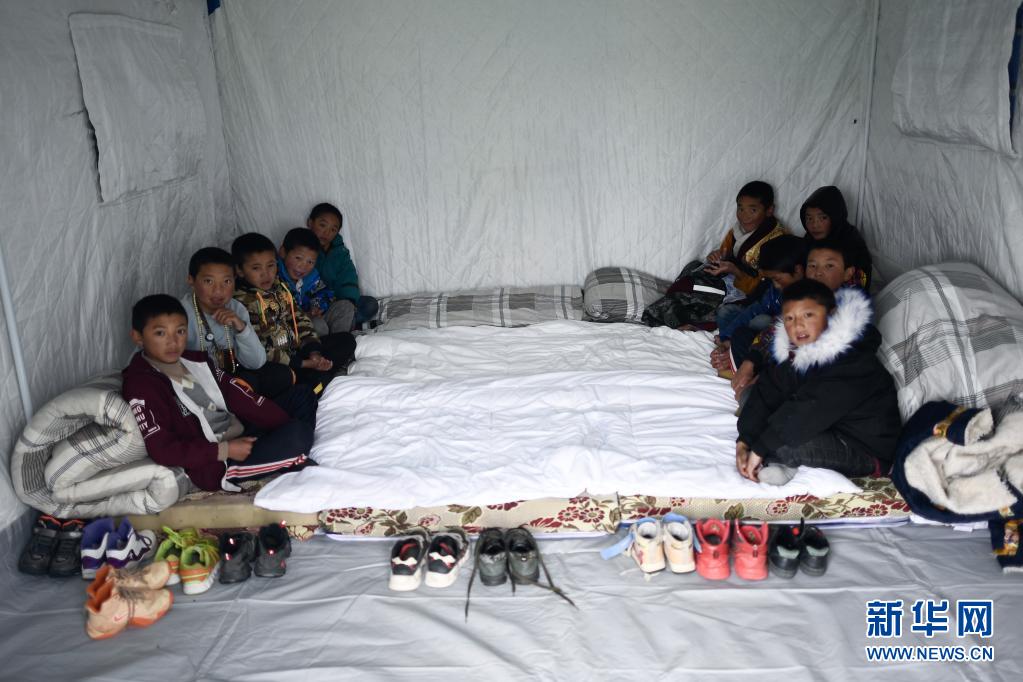 22日、瑪多県黄河郷の寄宿学校に設置された避難所で休む子どもたち。(瑪多=新華社記者/薛玉斌)