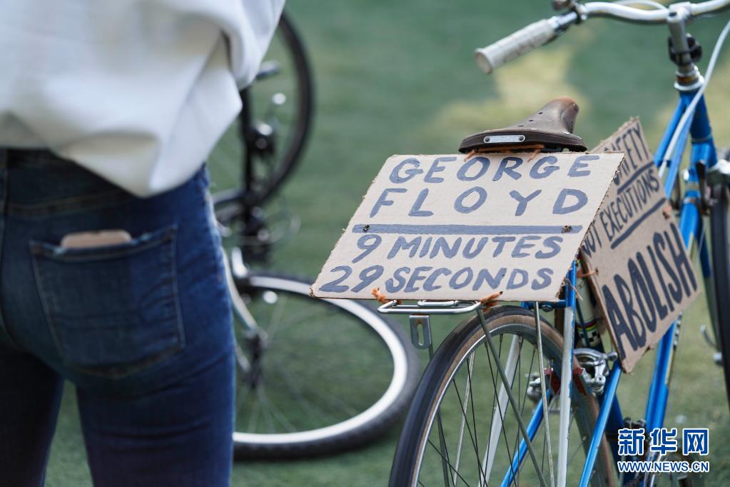 25日、追悼集会が開かれたニューヨーク市のキャッドマン・プラザ・パークで、自転車に取り付けられたプラカード。(ニューヨーク=新華社記者/王迎)