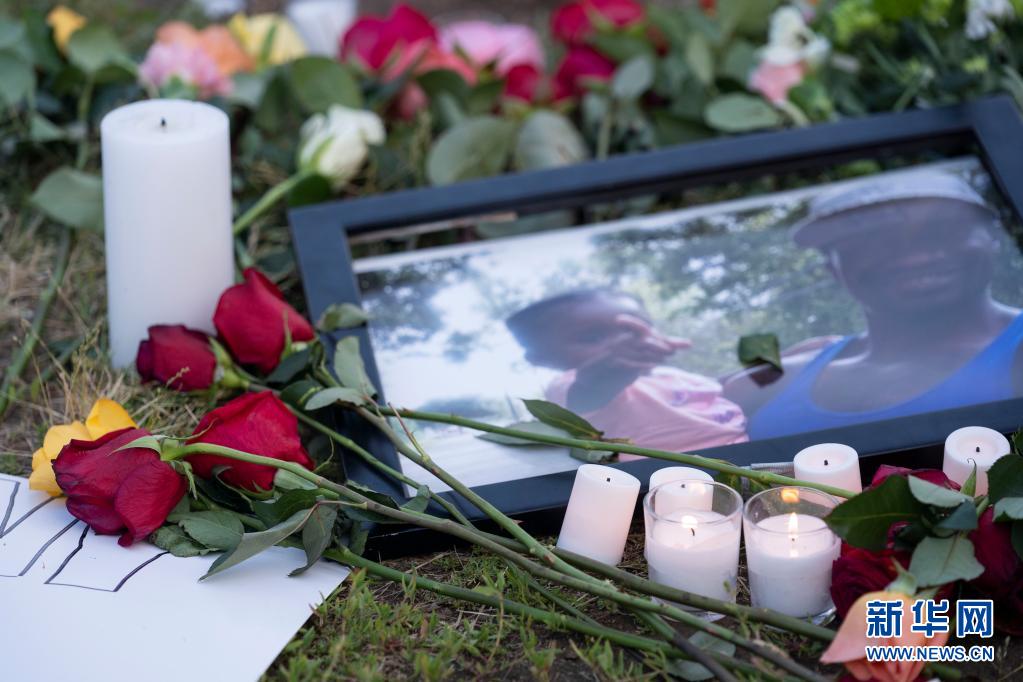25日、追悼集会が開かれた米ワシントンのホワイトハウス近くで、フロイドさんと家族の写真の周りに置かれた花とろうそく。(ニューヨーク=新華社記者/劉傑)
