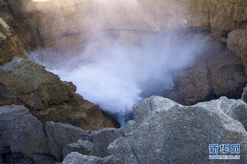 25日、ニュージーランド・プナカイキで、独特な形の岩が並ぶパンケーキ・ロックスの一角。(ウェリントン=新華社配信/張健勇)