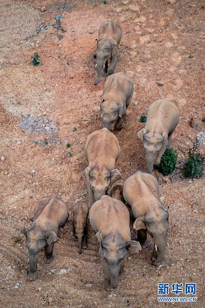 28日、雲南省玉渓市峨山イ族自治県で撮影したゾウの群れ。(小型無人機から、玉渓=新華社記者/胡超)