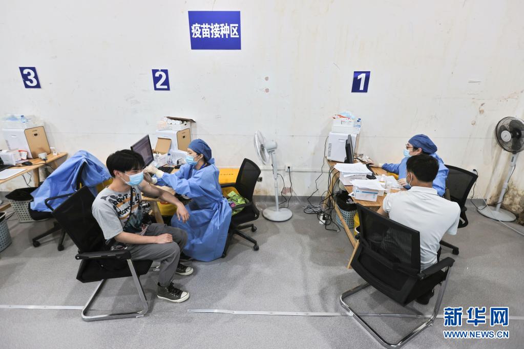 29日、上海市虹橋駅の臨時ワクチン接種拠点でワクチン接種を受ける旅行客。(上海=新華社記者/王翔)