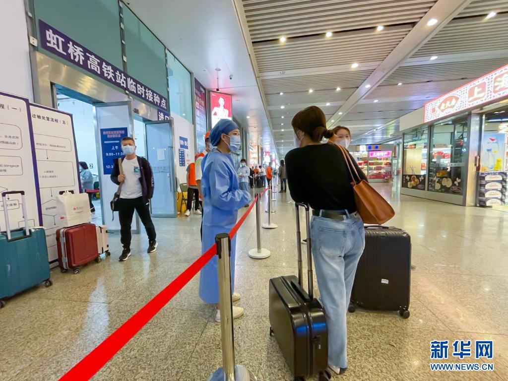 29日、上海市虹橋駅の臨時ワクチン接種拠点で医療スタッフに質問する旅行客。(上海=新華社記者/黄安琪)