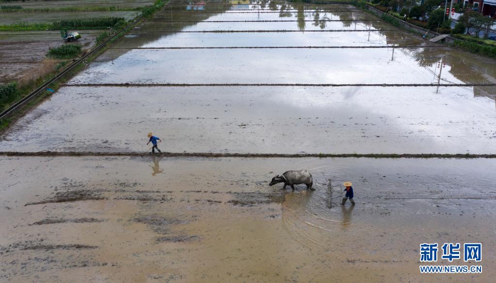 1日、漁山郷の浙江省級食糧生産機能区にある1千ムーの田んぼで、農作業にいそしむ農家の人たち。(小型無人機から、杭州=新華社記者/徐昱)