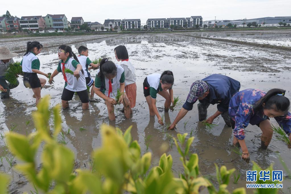 1日、漁山郷の浙江省級食糧生産機能区にある1千ムーの田んぼで、田植えを体験する漁山郷中心小学校の児童ら。(杭州=新華社記者/徐昱)