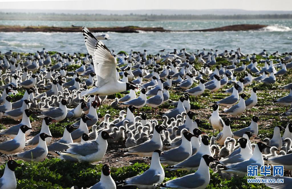 2日、紅鹼淖湿地保護区にある鳥島に集まるゴビズキンカモメ。(神木=新華社記者/陶明)