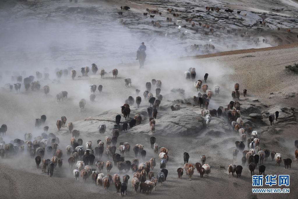 5日、新疆ウイグル自治区ブルルトカイ県で家畜を春・秋用の牧場から夏用の牧場へ移動させる牧畜民。(アルタイ=新華社記者/沙達提)