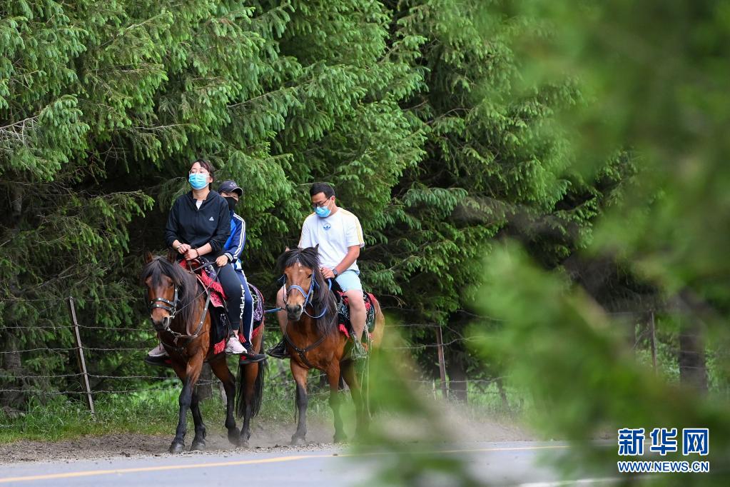 3日、ナラティ観光風景区で乗馬を楽しむ観光客。(ウルムチ=新華社記者/丁磊)