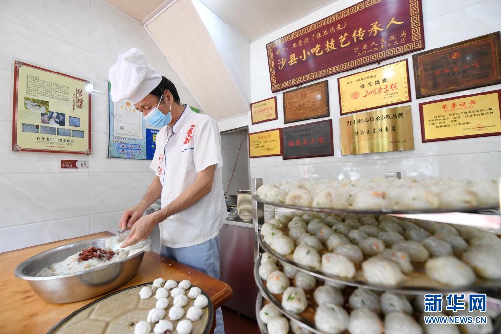 10日、焼麦(シャオマイ)を作る沙県佳蘭焼麦の伝承者、王景熙(おう・けいき)さん。(三明=新華社記者/林善伝)