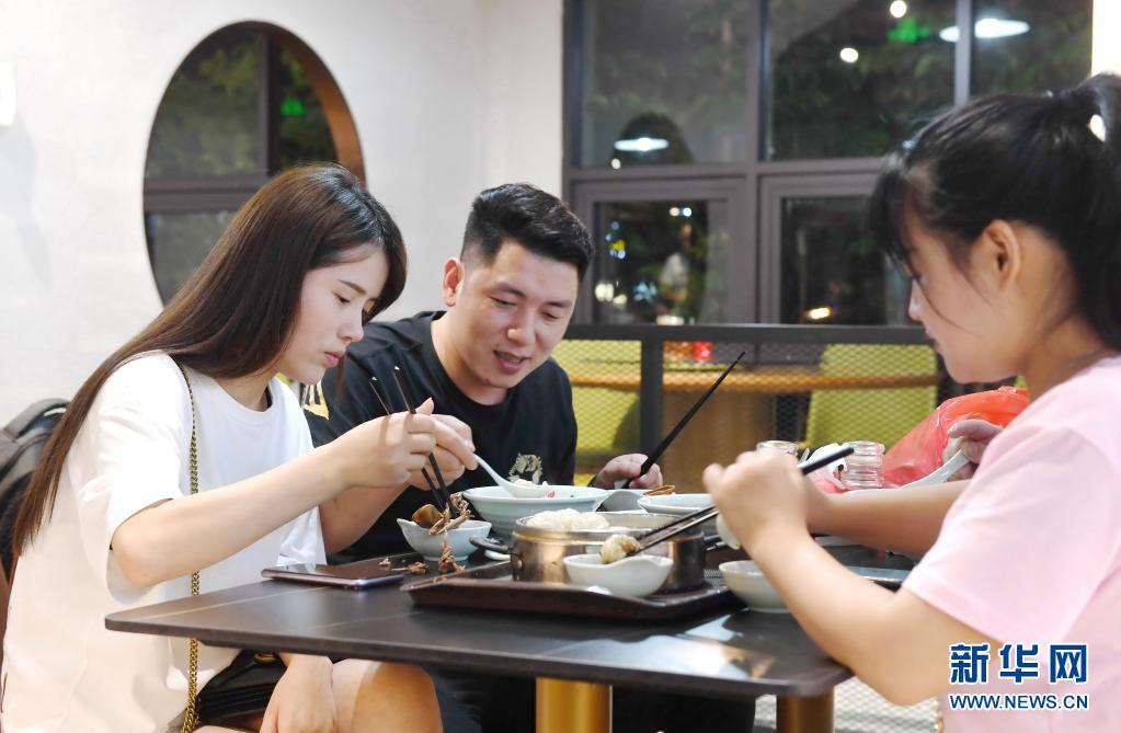 10日、沙県区の小吃店で小吃を味わう観光客。(三明=新華社記者/林善伝)