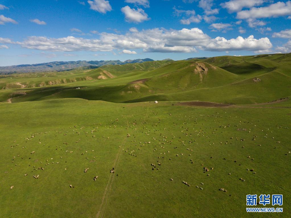 15日、裕民県バルルク山地域の草原に広がる夏の牧場で、草をはむ羊の群れ。(小型無人機から、裕民=新華社記者/胡虎虎)