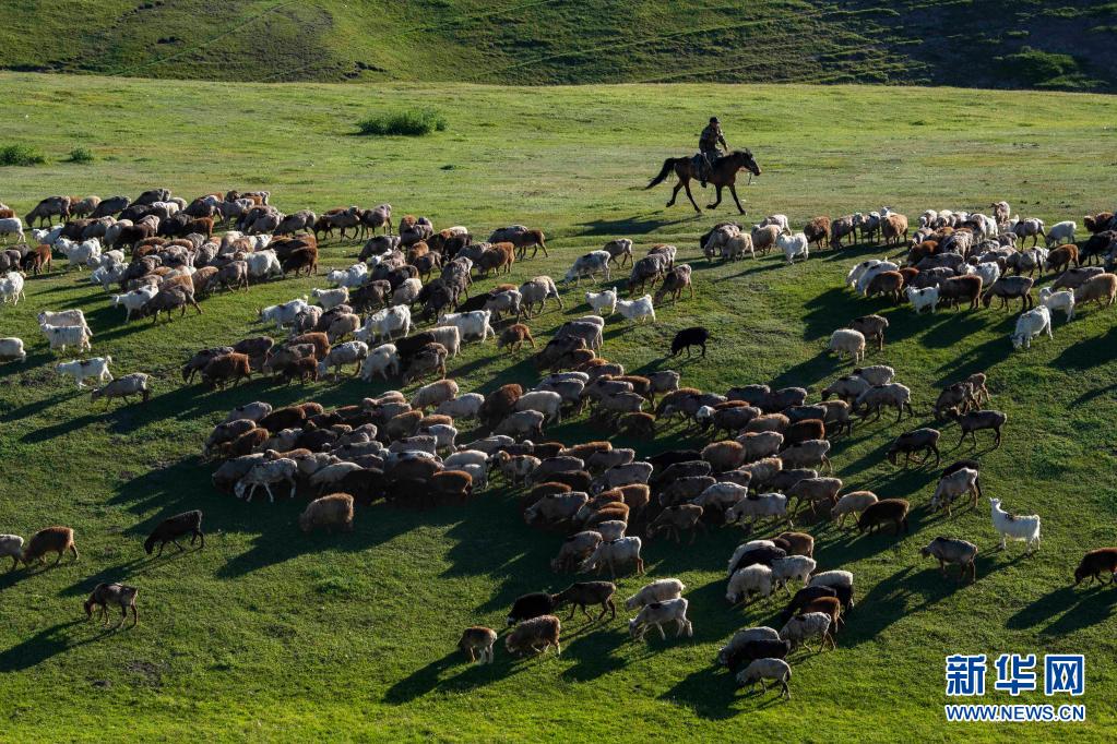 14日、裕民県バルルク山地域の草原に広がる夏の牧場で、羊を放牧する牧畜民。(裕民=新華社記者/胡虎虎)