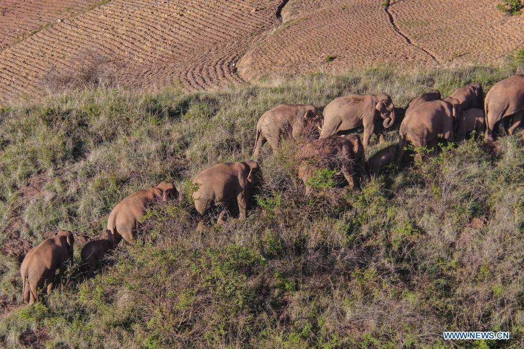 19日、雲南省玉渓市峨山イ族自治県大竜潭郷で確認されたゾウの群れ。(小型無人機から)