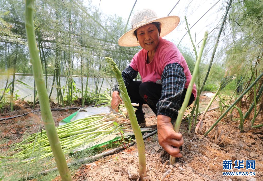 22日、アスパラガスを収穫する全椒県六鎮鎮大張村の住民。(滁州=新華社配信/沈果)
