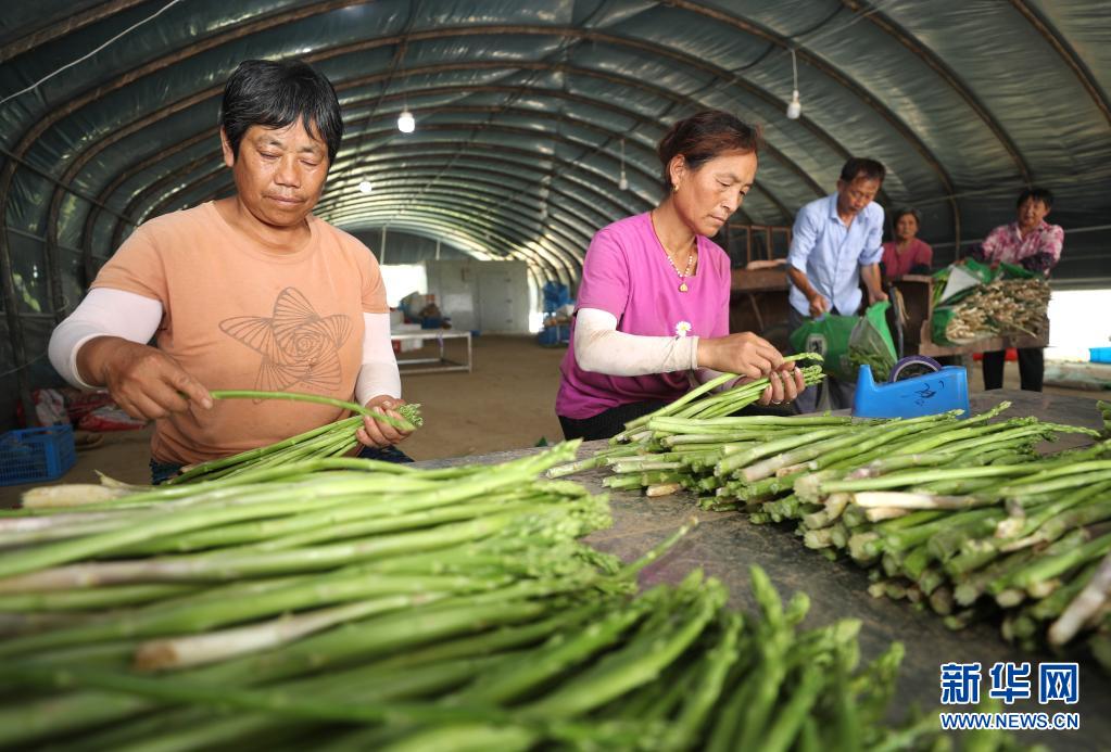 22日、アスパラガスを仕分けて包装する全椒県六鎮鎮大張村の住民。(滁州=新華社配信/沈果)