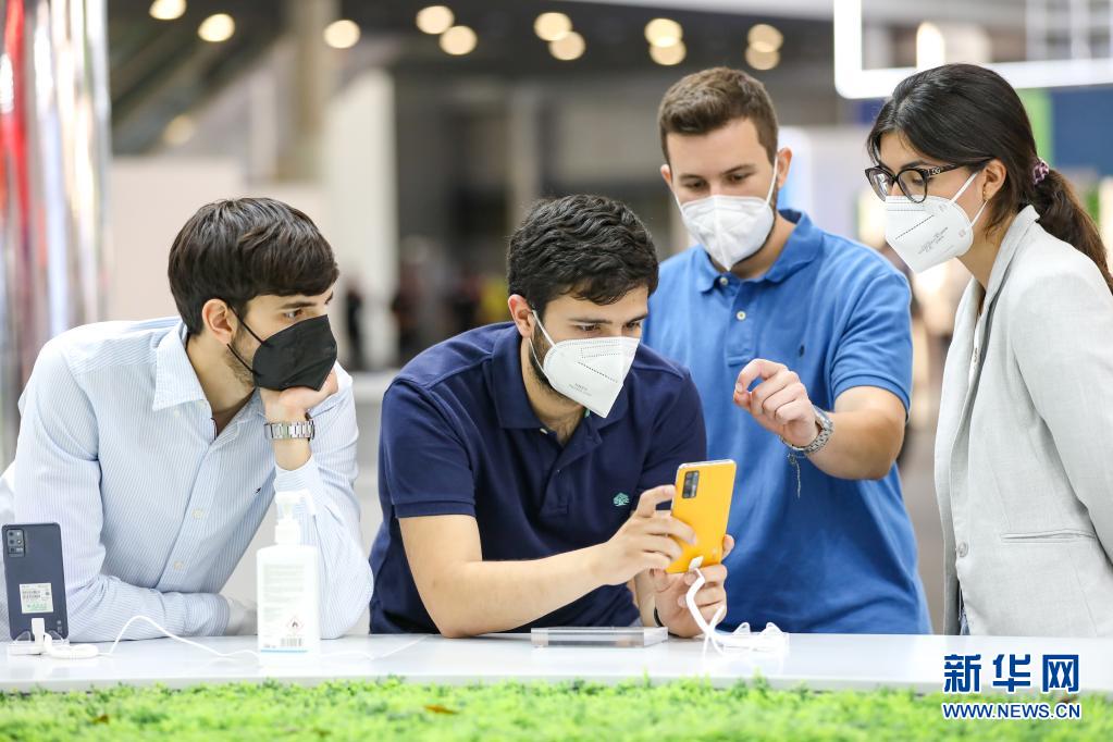 28日、中興通訊(ZTE)の展示ブースで第5世代移動通信システム(5G)対応スマートフォンを体験する来場者。(バルセロナ=新華社記者/張鋮)