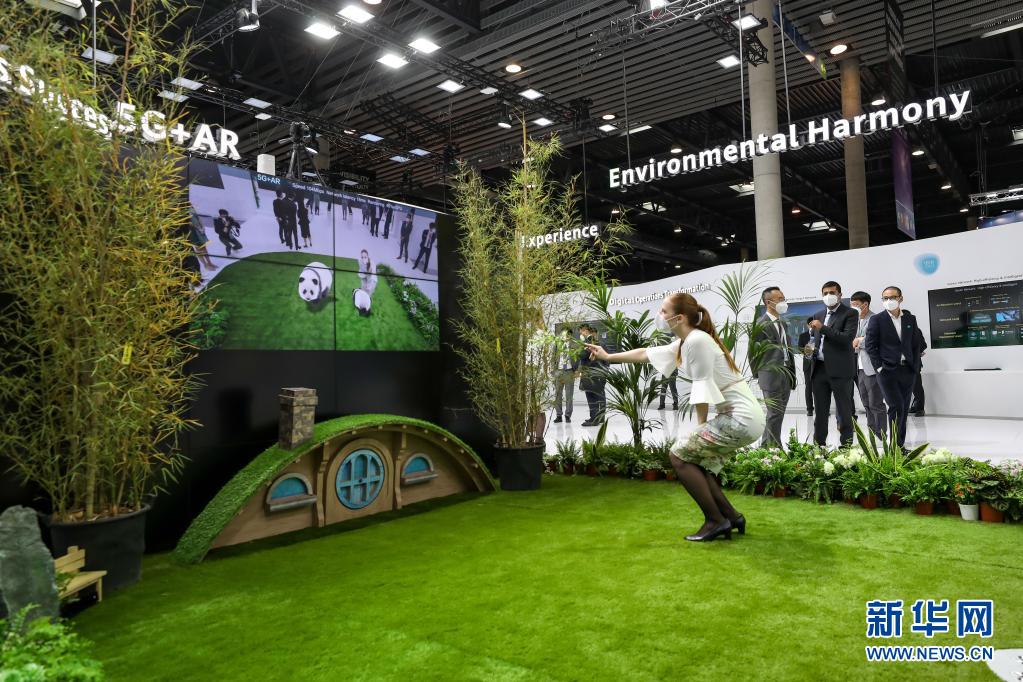 28日、華為技術(ファーウェイ)の展示ブースで第5世代移動通信システム(5G)と拡張現実(AR)を組み合わせた技術を体験する来場者。(バルセロナ=新華社記者/張鋮)