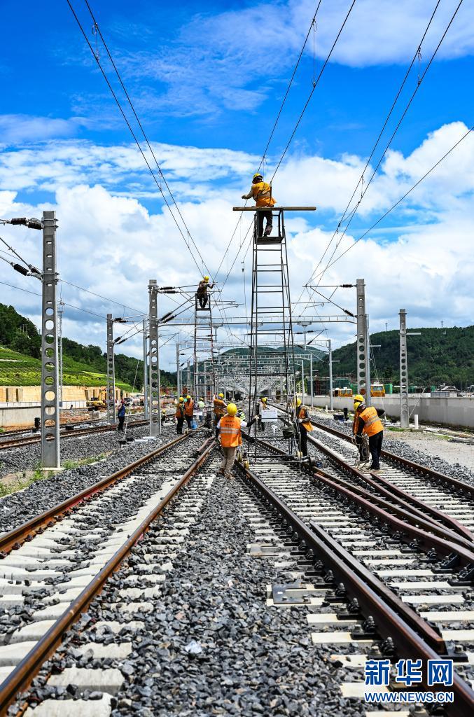 2日、中老昆万鉄道寧洱(ねいじ)駅の工事現場で働く作業員。(普洱=新華社記者/王冠森)