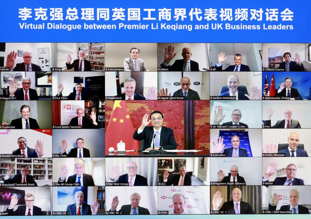 中国の李克強(り・こくきょう)国務院総理は6日、オンライン形式で開かれた英商工界代表との対話会に北京の中南海紫光閣から出席し、中英関係と実務協力、新型コロナウイルス感染症、気候変動対応、ビジネス環境最適化、サービス貿易協力深化、人的・文化的交流促進などについて話し合った。(北京=新華社記者/丁林)