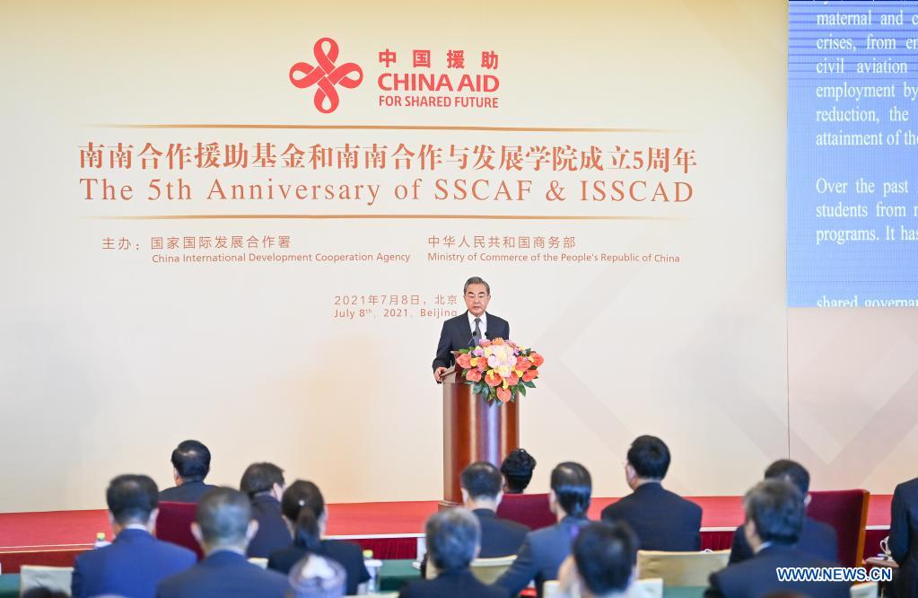 中国の王毅(おう・き)国務委員兼外交部長は8日、南南協力援助基金と南南協力・発展学院の設立5周年記念行事に出席し、習近平(しゅう・きんぺい)国家主席の祝賀書簡を読み上げた。(北京=新華社記者/李響)