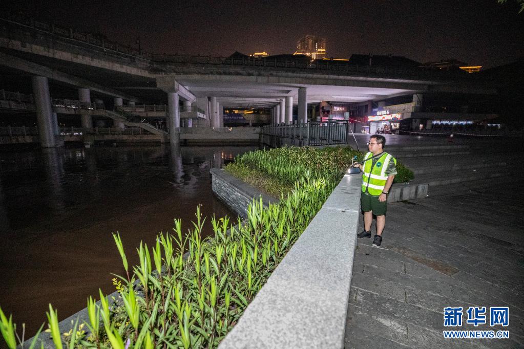 12日、重慶市沙坪壩(さへいは)区にある磁器口古鎮で、嘉陵江の川沿いを歩いて水位を観測する巡視員。(重慶=新華社記者/黄偉)
