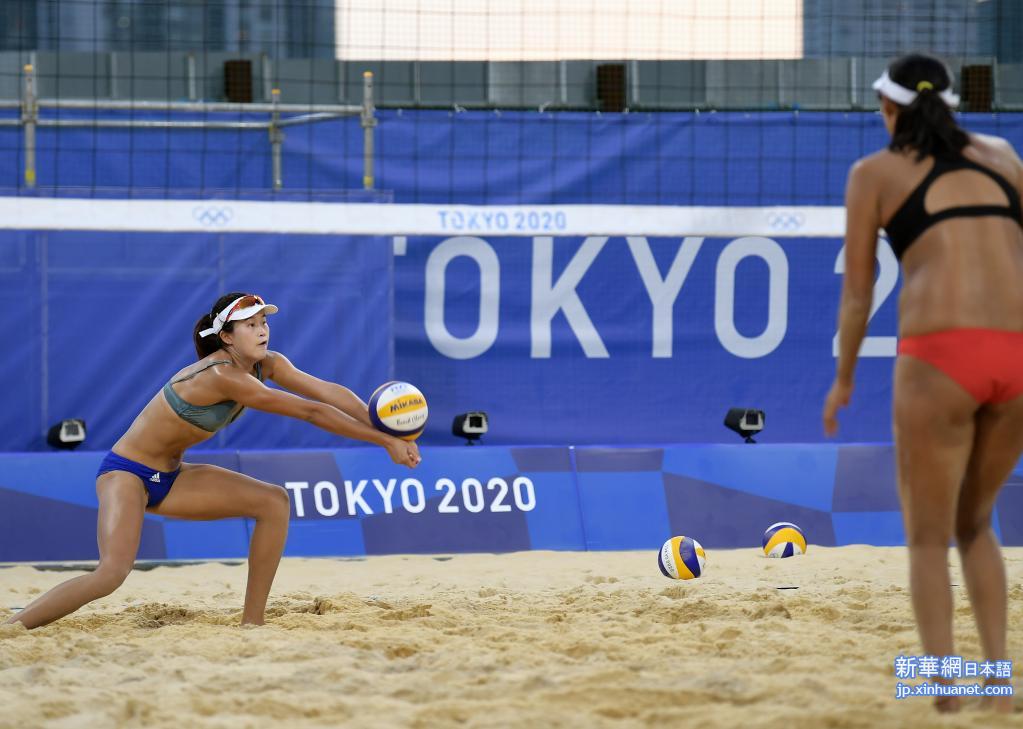 22日、練習に励むビーチバレー女子中国代表の王鑫鑫(おう・きんきん、左)。(東京=新華社記者/李賀)