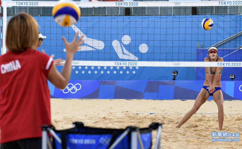 22日、練習に励むビーチバレー女子中国代表の王鑫鑫(おう・きんきん、右)。(東京=新華社記者/李賀)