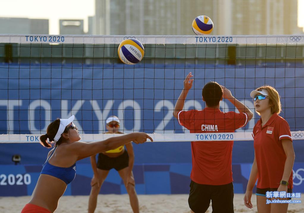 22日、ビーチバレー女子中国代表の夏欣怡(か・きんい、手前左)を指導する岳園(がく・えん)監督(手前右)。(東京=新華社記者/李賀)