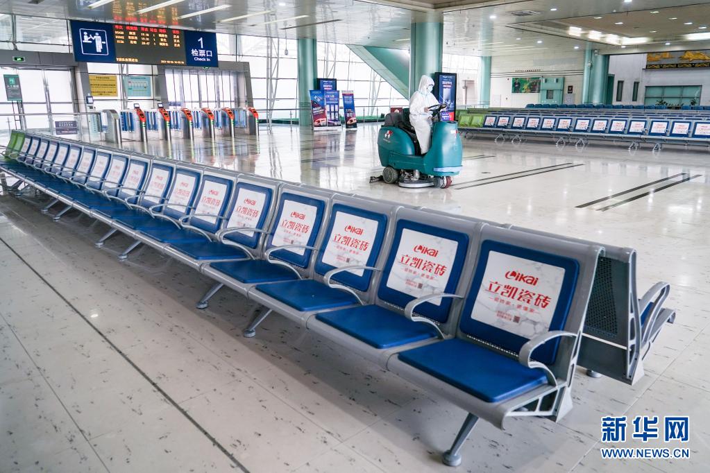 6日、揚州駅の待合室を清掃、消毒するスタッフ。(揚州=新華社記者/李博)