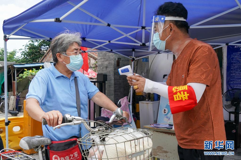 6日、揚州市広陵区文峰街道三里橋社区(コミュニティー)で、居住区に入る住民の体温を測り、健康コードなどの情報を確認する社区のスタッフ。(揚州=新華社記者/李博)