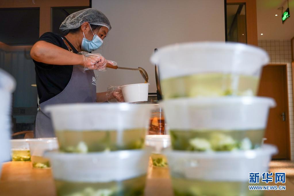 6日、揚州市広陵区の文峰街道社区センターの厨房で、料理を器に分ける配食サービスチームのスタッフ。(揚州=新華社記者/李博)