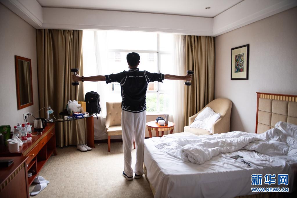 8日、張家界市武陵源区の青和錦江国際ホテルの客室内で筋トレをする宿泊客。張家界市は3日、感染の拡散を防ぐため市民や観光客の市外への移動を禁じた。(張家界=新華社記者/陳思汗)
