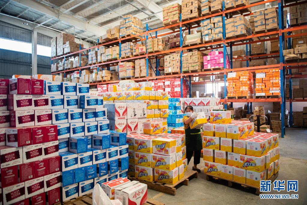 5日、湖南省で事業展開するスーパーチェーン「梅尼超市」の張家界市の配送センターで飲料商品を運ぶスタッフ。(張家界=新華社記者/陳思汗)