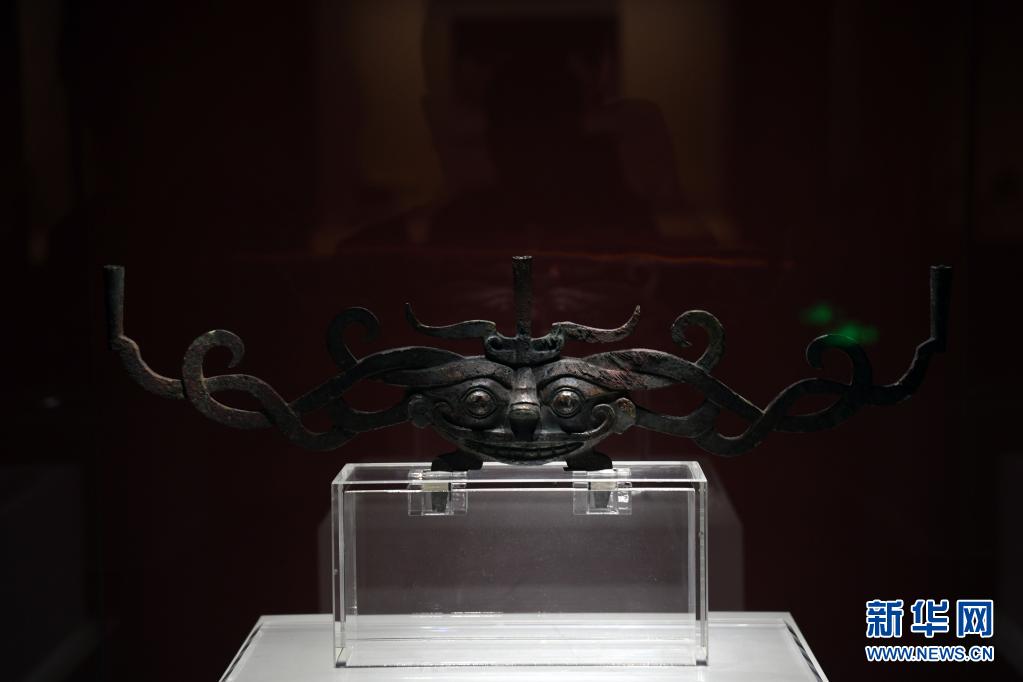 10日、「海宇攸同-広州秦漢考古成果展」で展示された双面獣首鎏金銅屏風頂飾(そうめんじゅうしゅりゅうきんびょうぶちょうしょく)。(北京=新華社記者/金良快)
