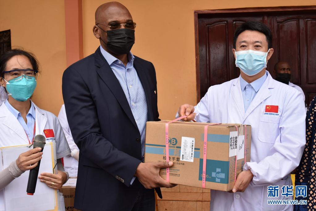 12日、バンガンテ市のエリック・ニヤット市長(中央)に医療物資を手渡す中国医療チームのリーダー、田源(でん・げん)氏。(ヤウンデ=新華社配信)