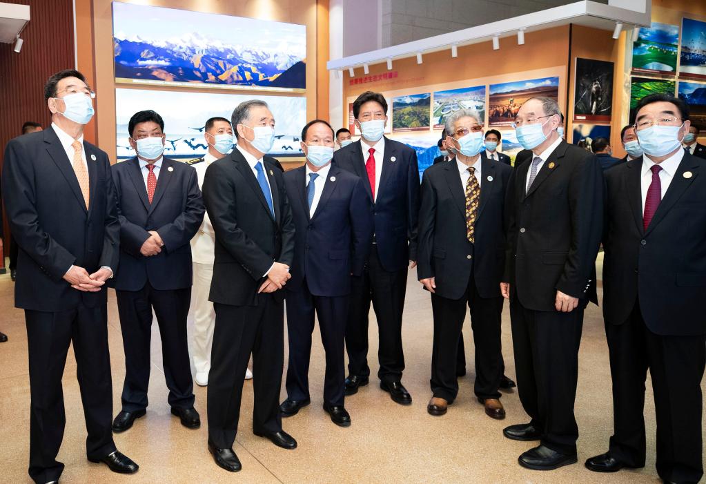 18日、チベット博物館でチベット平和解放70周年成果展の開幕式に出席し、展示を見学する汪洋氏と代表団。(北京=新華社記者/黄敬文)