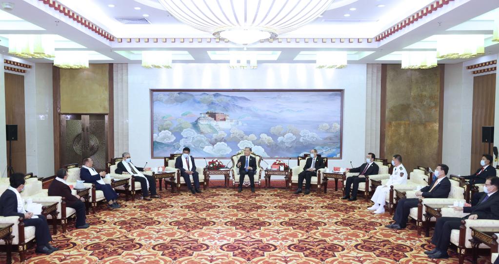 18日、党中央と習近平(しゅう・きんぺい)総書記の委託を受け、ラサのホテルでチベット自治区の指導幹部、元幹部らと会見し、親しくあいさつをする汪洋氏。(北京=新華社記者/劉彬)