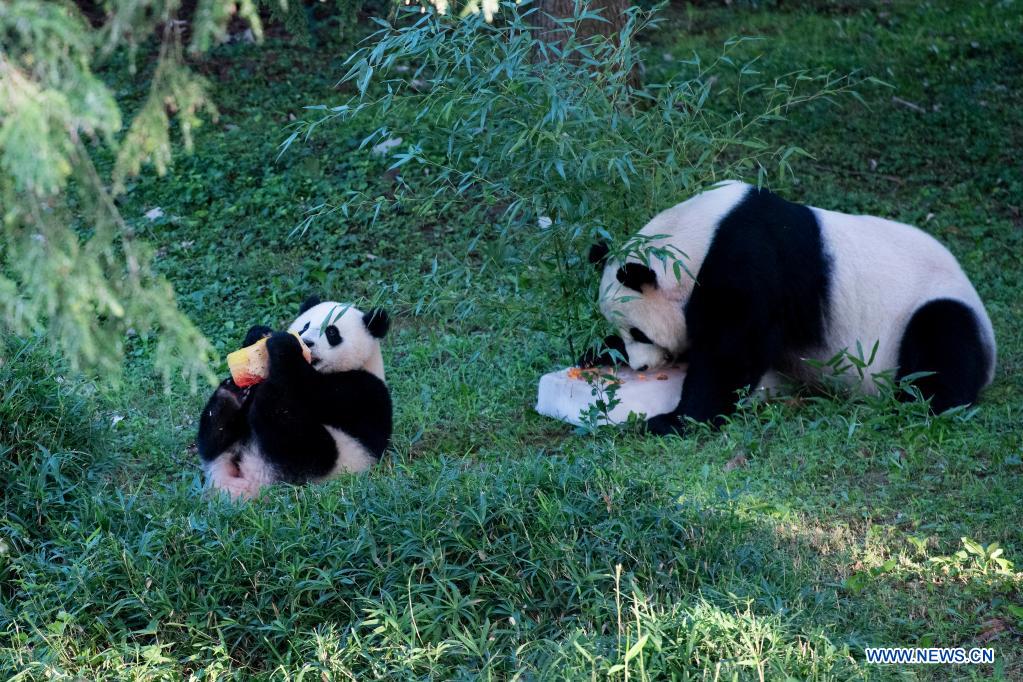 21日、米ワシントンのスミソニアン国立動物園で、母親パンダのメイシャンと一緒に果物入りの氷のケーキを食べるシャオチージー(左)。(ワシントン=新華社記者/劉傑)