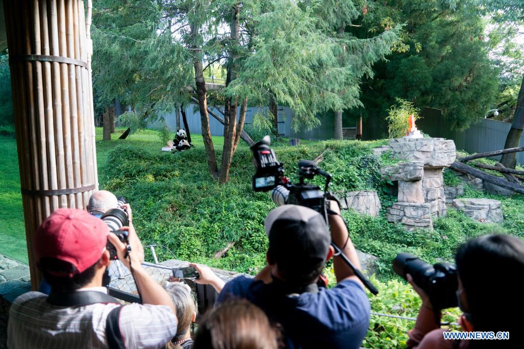 21日、米ワシントンのスミソニアン国立動物園でシャオチージーを撮影するメディア関係者。(ワシントン=新華社記者/劉傑)